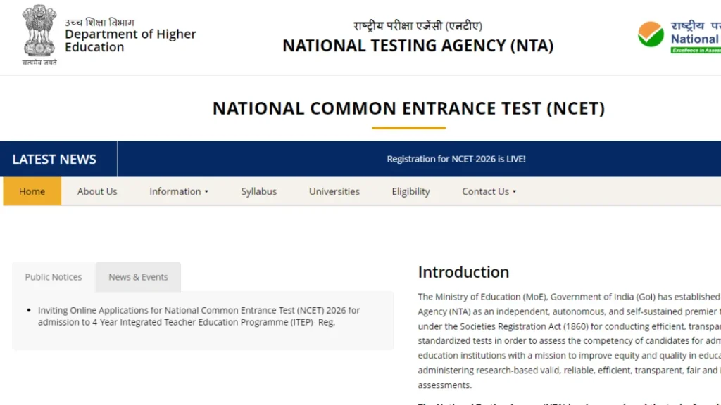 The NTA NCET Online Form 2026 has been released by the National Testing Agency (NTA) on its official website. The National Common Entrance Test (NCET) 2026 is conducted for admission to the 4-Year Integrated Teacher Education Programme (ITEP) offered by various Central Universities, State Universities, IITs, NITs, Regional Institutes of Education (RIEs), and Government Colleges across India.
