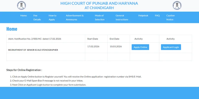 Candidates who want to apply for the Punjab and Haryana High Court Senior Scale Stenographer Recruitment 2026 must complete the application process through the official website. The application form will be available online, and applicants should carefully follow each step to avoid any mistakes.