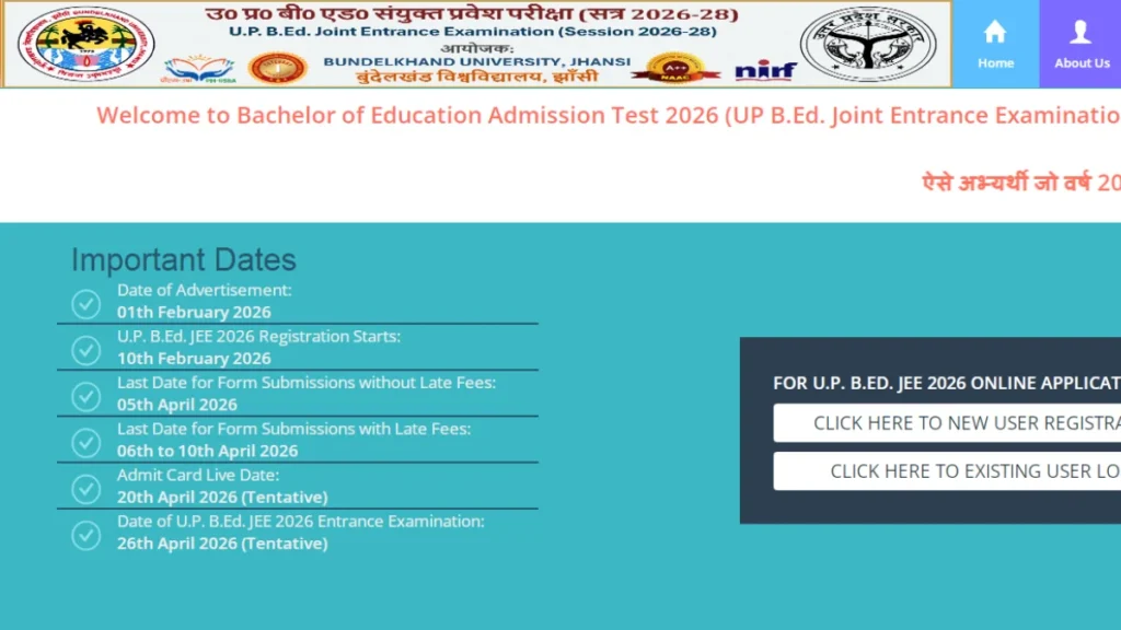 The Uttar Pradesh B.Ed Online Form 2026 has been released by Bundelkhand University, Jhansi on its official website. The entrance examination is conducted for admission to the Uttar Pradesh Bachelor of Education (B.Ed) Joint Entrance Examination 2026. This exam allows candidates to take admission in the two-year B.Ed course offered by various universities and colleges in Uttar Pradesh.